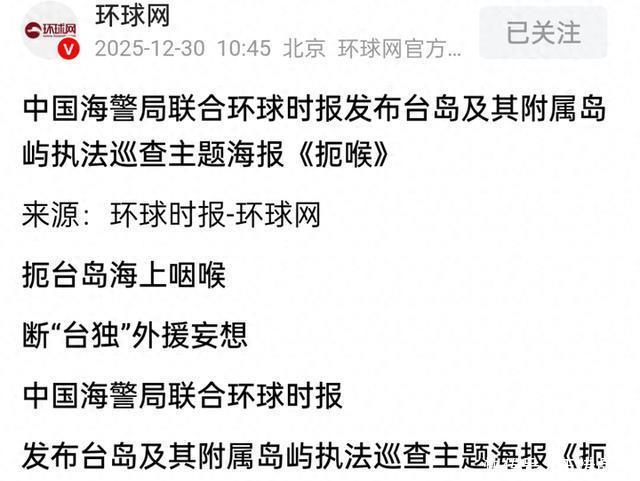 《环球时报》12月30日报道《中国海警局联合环球时报发布台岛及其附属岛屿执法巡查主题海报《扼喉》》